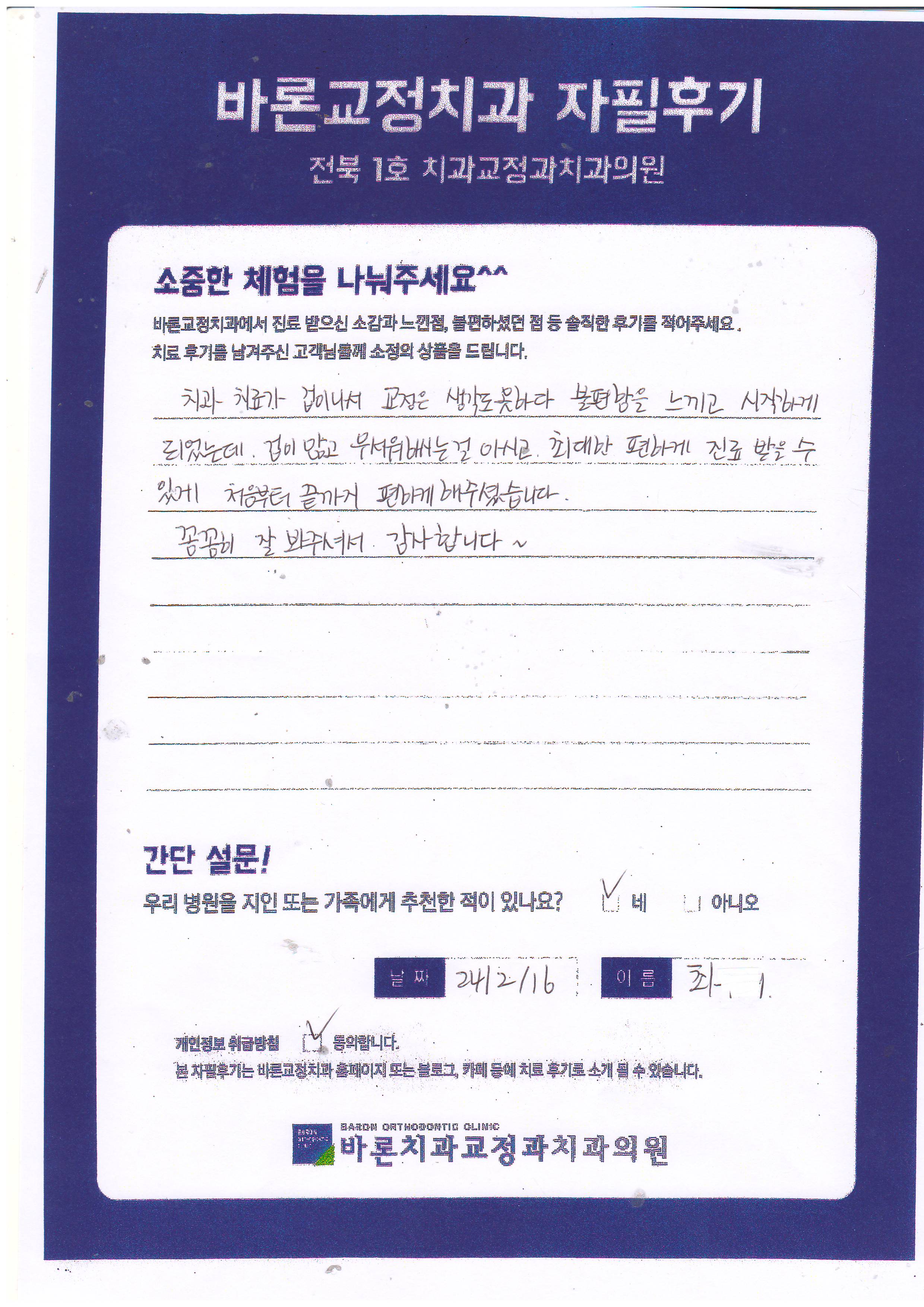 치과 치료가 겁이 나서 교정은 생각도 못하다 불편함을 느끼고 시작하게 되었는데, 겁이 많고 무서워하시는걸 아시고 최대한 편하게 진료 받을 수 있게 처음부터 끝까지 편하게 해주셨습니다. 꼼꼼히 잘 봐주셔서 감사합니다~ 최**고객님 후기 감사합니다.