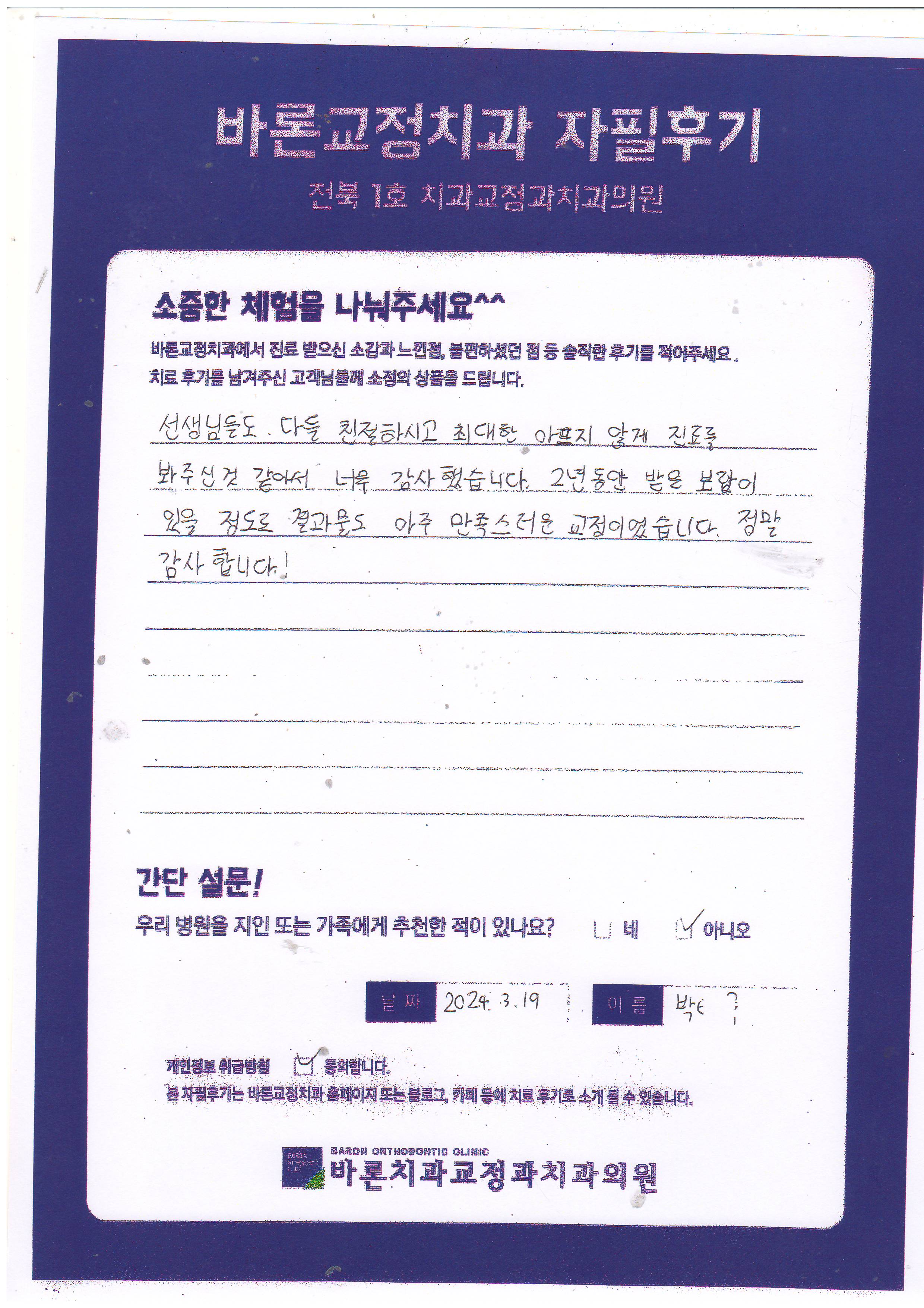 선생님들도 다들 친절하시고, 최대한 아프지 않게 진료를 봐 주신거 같아서 너무 감사했습니다. 2년동안 받은 보람이 있을 정도로 결과물도 아주 만족스러운 교정이었습니다. 정말 감사합니다.! 박** 고객님 후기 감사드립니다.