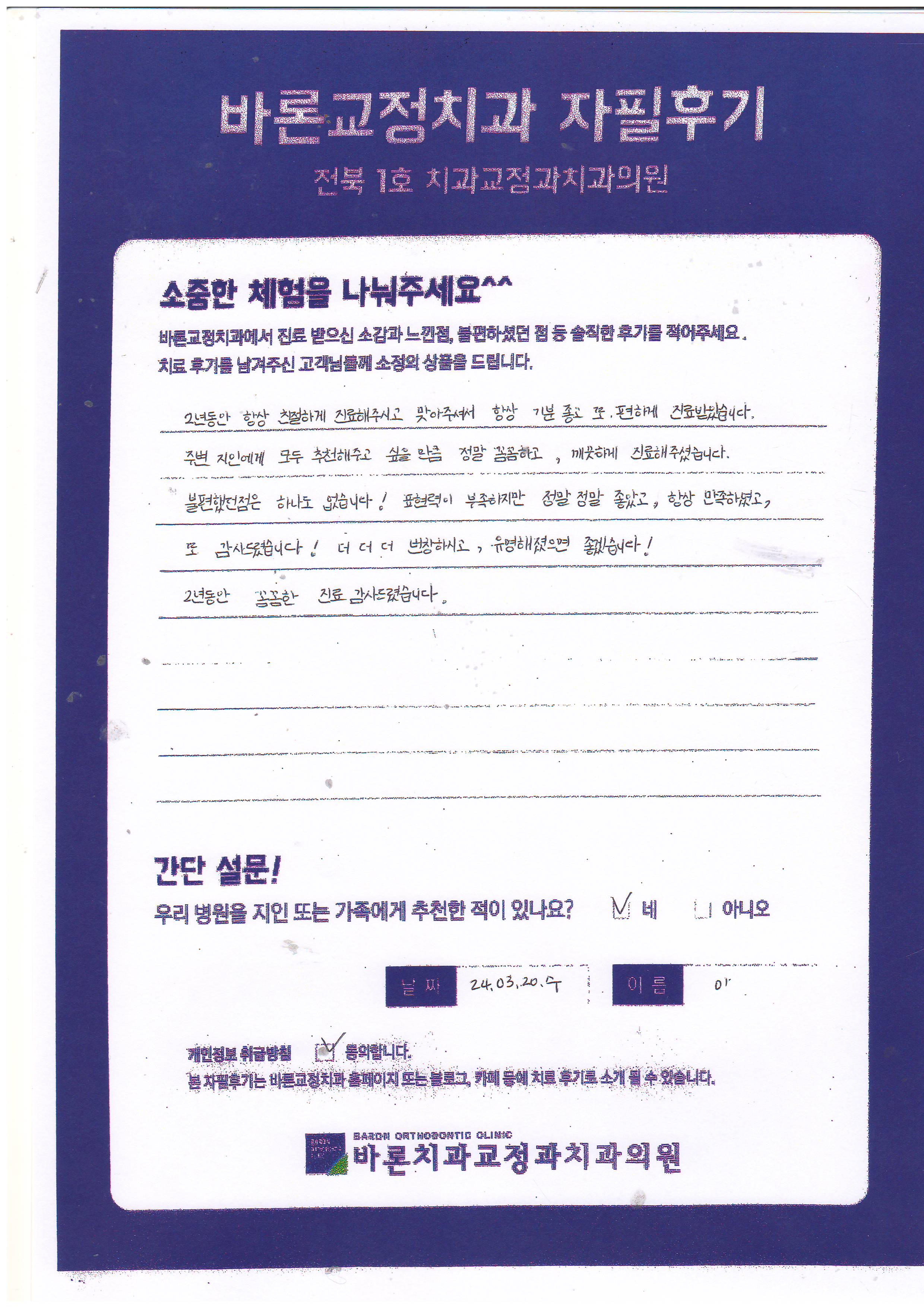 2년동안 항상 친절하게 진료해주시고, 맞아주셔서 항상 기분 좋고 또 편하게 진료받았습니다. 주변 지인에게 모두 추천해주고 싶을 만큼 정말 꼼꼼하고, 깨끗하게 진료해주셨습니다. 불편했던 점은 하나도 없습니다.! 표현력이 부족하지만 정말 정말 좋았고, 항상 만족하였고, 또 감사드렸습니다.! 더 더 더 번창하시고, 유명해졌으면 좋겠습니다.! 2년동안 꼼꼼한 진료감사드렸습니다. 이**고객님 후기 감사드립니다.