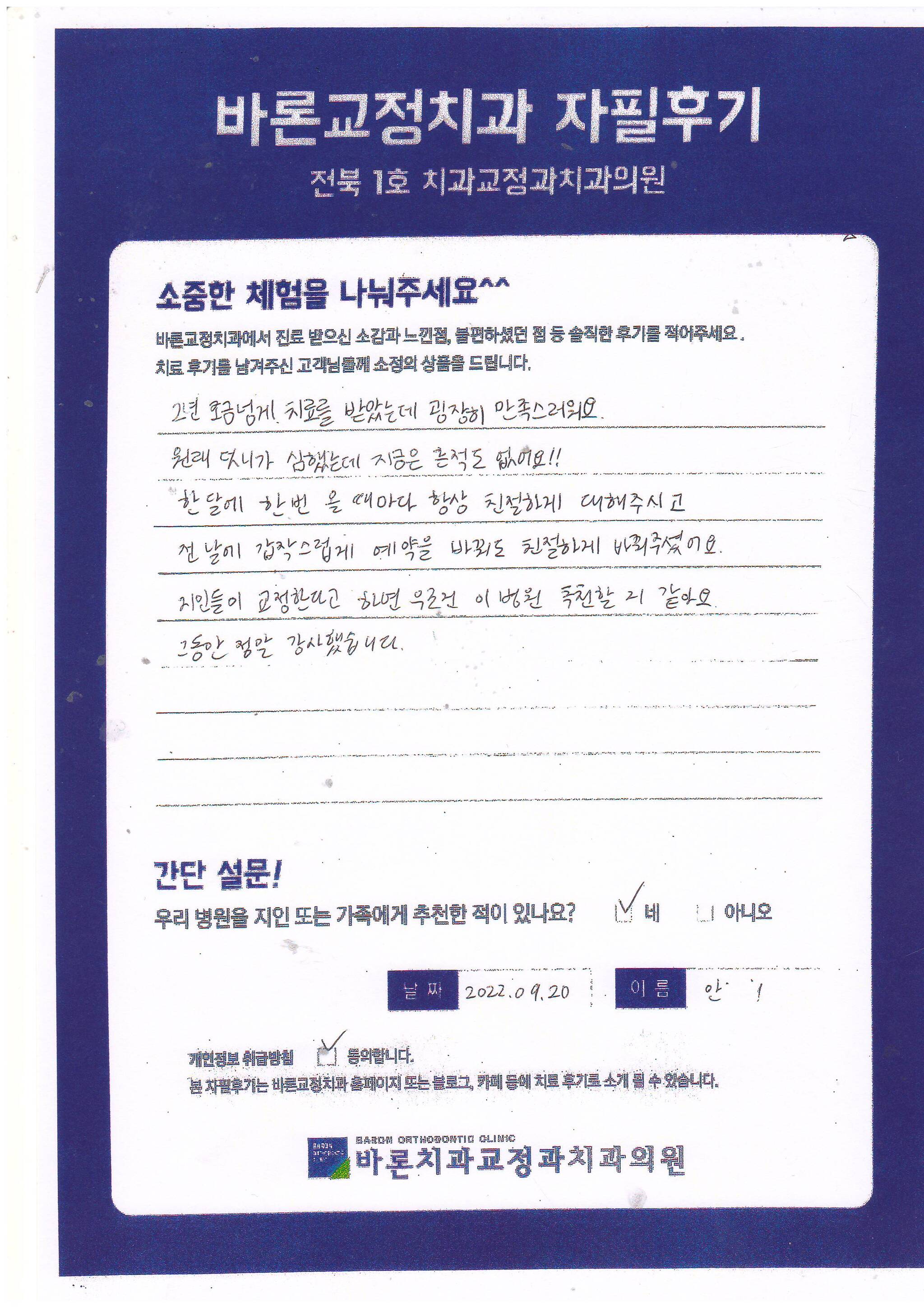 2년 조금 넘게 치료를 받았는데 굉장히 만족스러워요. 원래 덧니가 심했는데 지금은 흔적도 없어요!! 한 달에 한번 올 때마다 항상 친절하게 대해주시고 전날에 갑작스럽게 예약을 바꿔도 친절하게 바꿔주셨어요. 지인들이 교정한다고 하면 무조건 이 병원 추천할거 같아요. 그동안 정말 감사했습니다. 안** 고객님 후기 감사합니다.