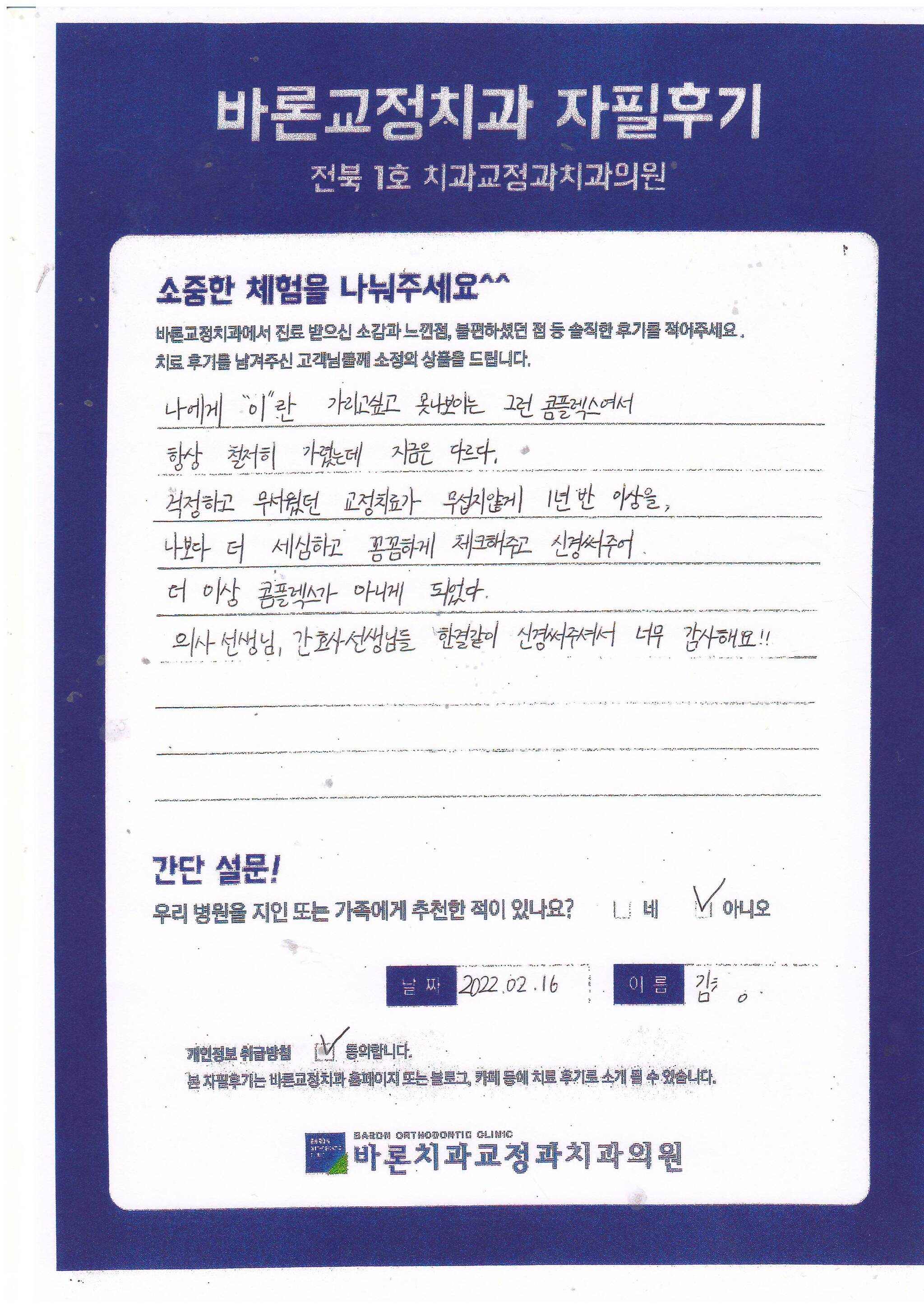 나에게 “이”란 가리고 싶고 못나 보이는 그런 콤플렉스여서 항상 철저히 가렸는데 지금은 다르다. 걱정하고 무서웠던 교정치료가 무섭지 않게 1년 반 이상을, 나보다 더 세심하고 꼼꼼하게 체크해주고 신경써주어 더 이상 콤플렉스가 아니게 되었다. 의사 선생님, 간호사 선생님들 한결같이 신경 써 주셔서 너무 감사해요!! 김** 고객님 후기 감사합니다.