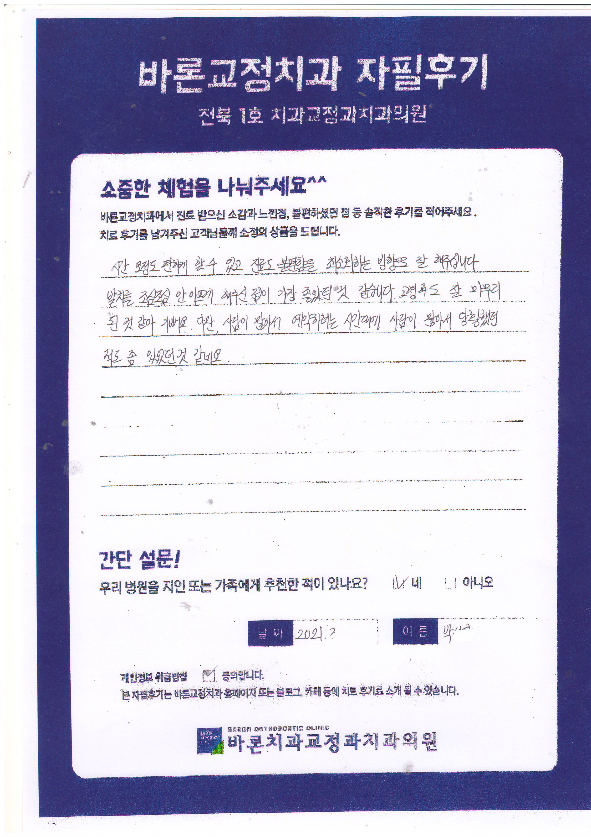 시간 조정도 편하게 할 수 있고 진료도 불편함을 최소화 하는 방향으로 잘 해 주십니다. 발치를 조심조심 안 아프게 해 주신 점이 가장 좋았던 것 같습니다. 교정하고 잘 마무리 된 것 같아 기뻐요. 다만 사람이 많아서 예약하려는 시간대에 사람이 많아서 당황 했던 적도 좀 있었던 것 같네요. <박** 고객님 후기 감사합니다.>