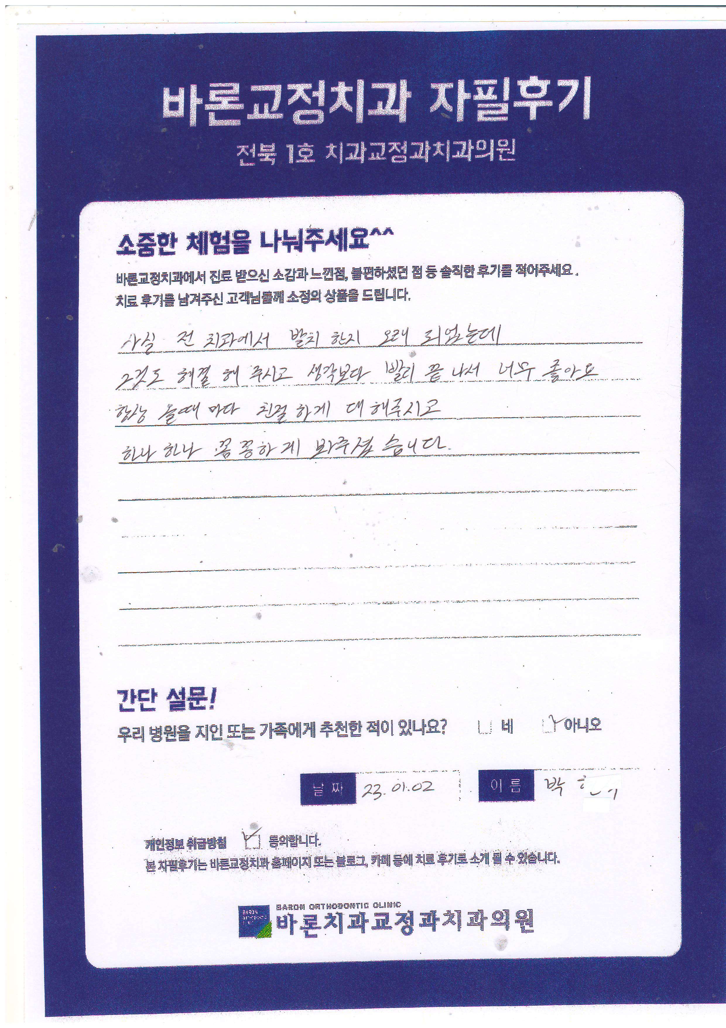 사실 , 전에 있던 치과에서 발치 한지 오래 되었는데 그것도 해결해 주시고 생각보다 빨리 끝나서 너무 좋아요 항상 올 때 마다 친절하게 대해주시고 하나하나 꼼꼼하게 봐주셨습니다. <박** 고객님 후기 감사합니다.>