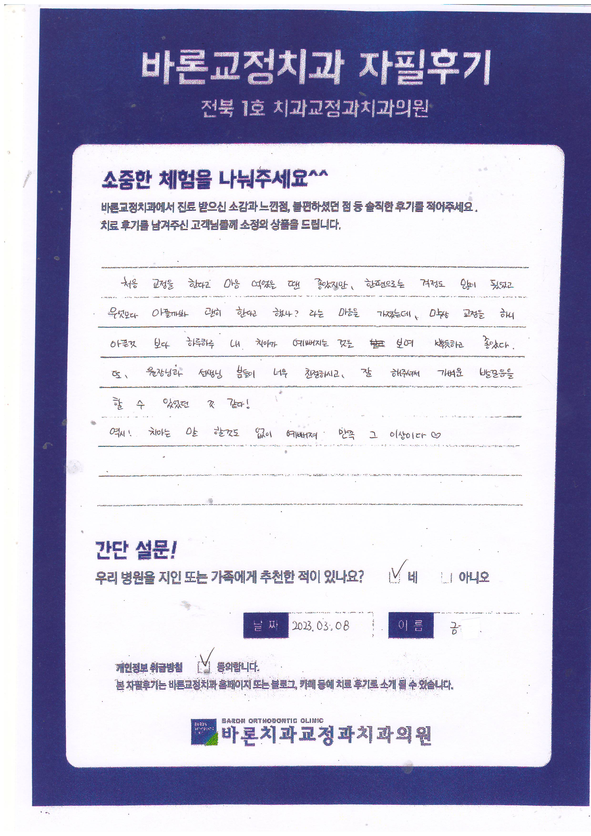 처음 교정을 한다고 마음 먹었을 땐 좋았지만, 한편으로는 걱정도 많이 됬었고 무엇보다 아플까봐 괜히 한다고 했나?라는 마음을 가졌는데, 막상 교정을 하니 아픈 것보다 하루하루 내 치아가 예뻐지는 것을 보며 뿌듯하고 좋았다. 또, 원장님과 선생님 분들이 너무 친절하시고, 잘해주셔서 가벼운 발걸음을 할 수 있었던 것 같다.! 역시! 치아는 말 할 것도 없이 예뻐져 만족 그 이상이다. ♡ <금** 고객님 후기 감사합니다.^^>