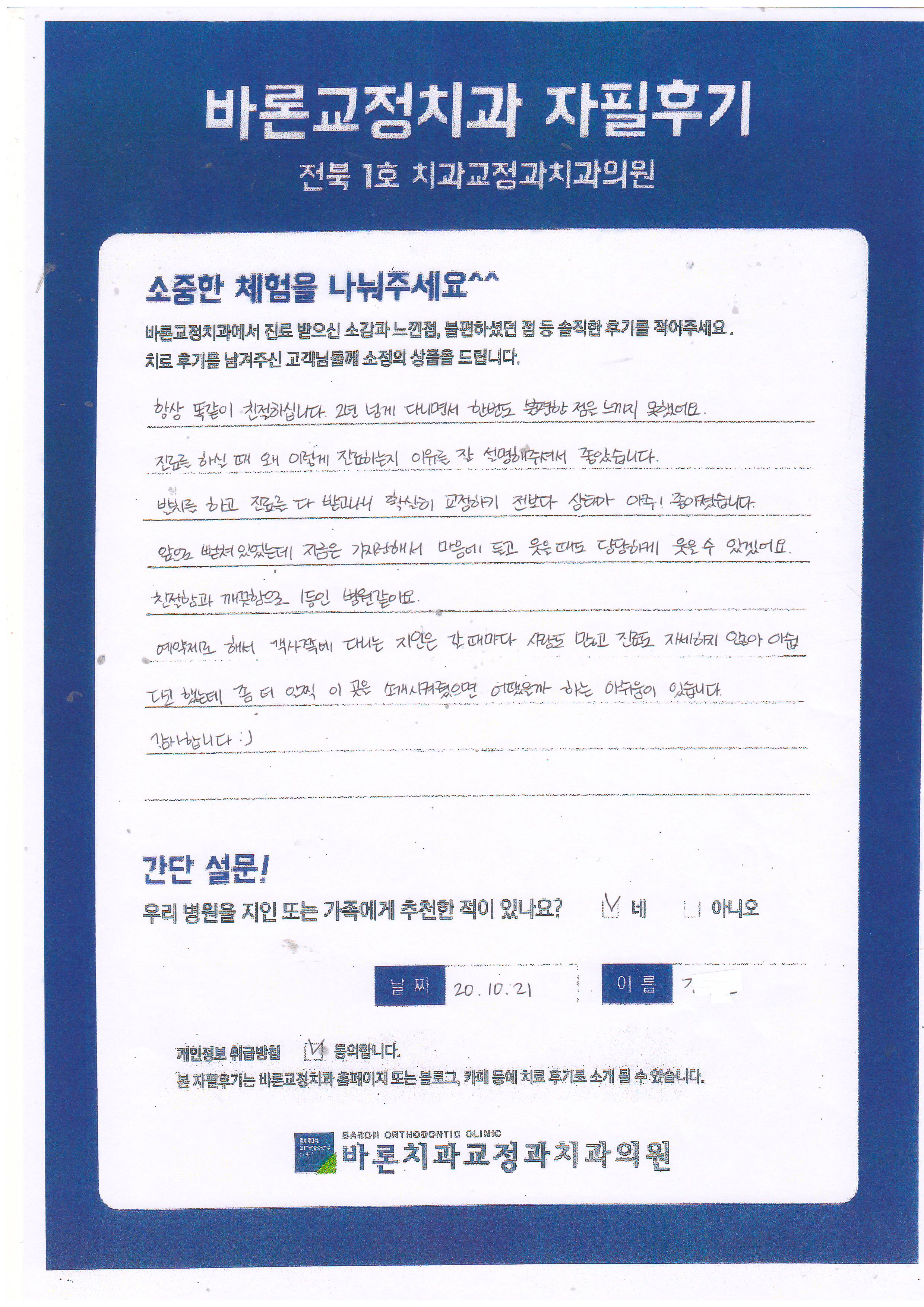 앞으로 뻗혀 있었는데 지금은 가지런해서 마음에 들고 웃을 때도 당당하게 웃을 수 있겠어요.
