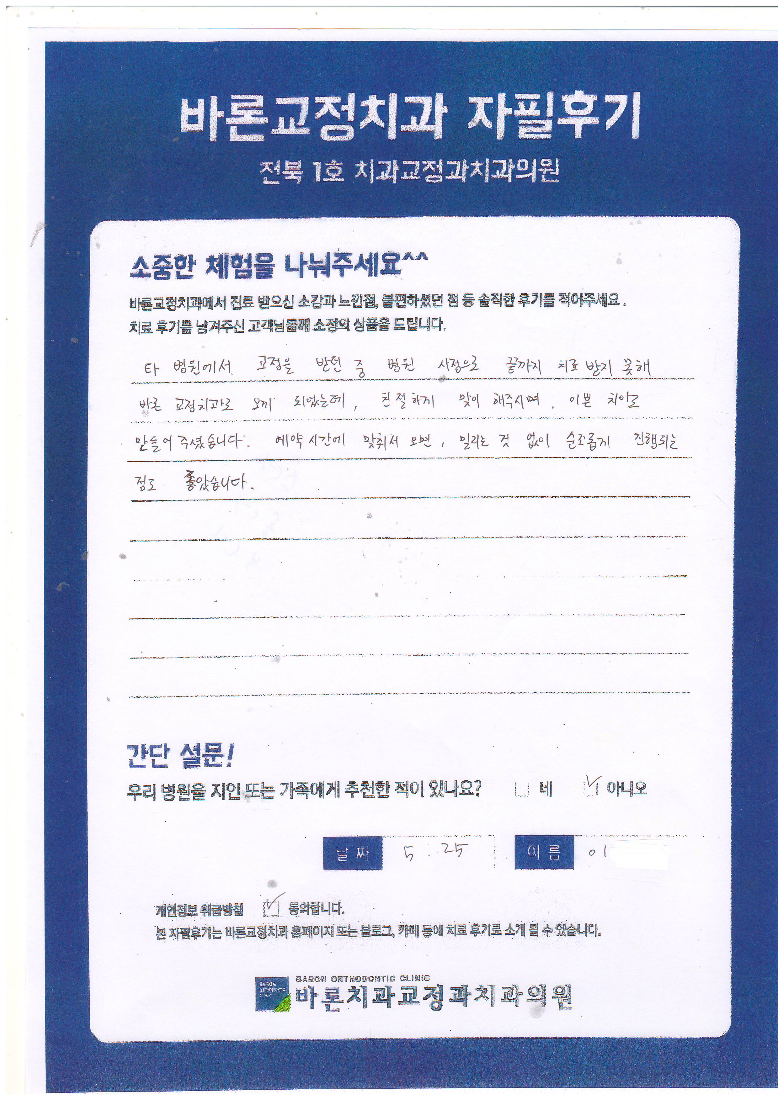 타병원에서 교정을 받던 중 병원사정으로 끝까지 치료받지 못해 바론교정치과로 오게 되었는데, 친절하게 맞이해주시며, 이쁜 치아로 만들어 주셨습니다. 예약시간에 맞춰서 오면, 밀리는 것 없이 순조롭게 진행되는 점도 좋았습니다. 이** 고객님 후기 감사합니다.