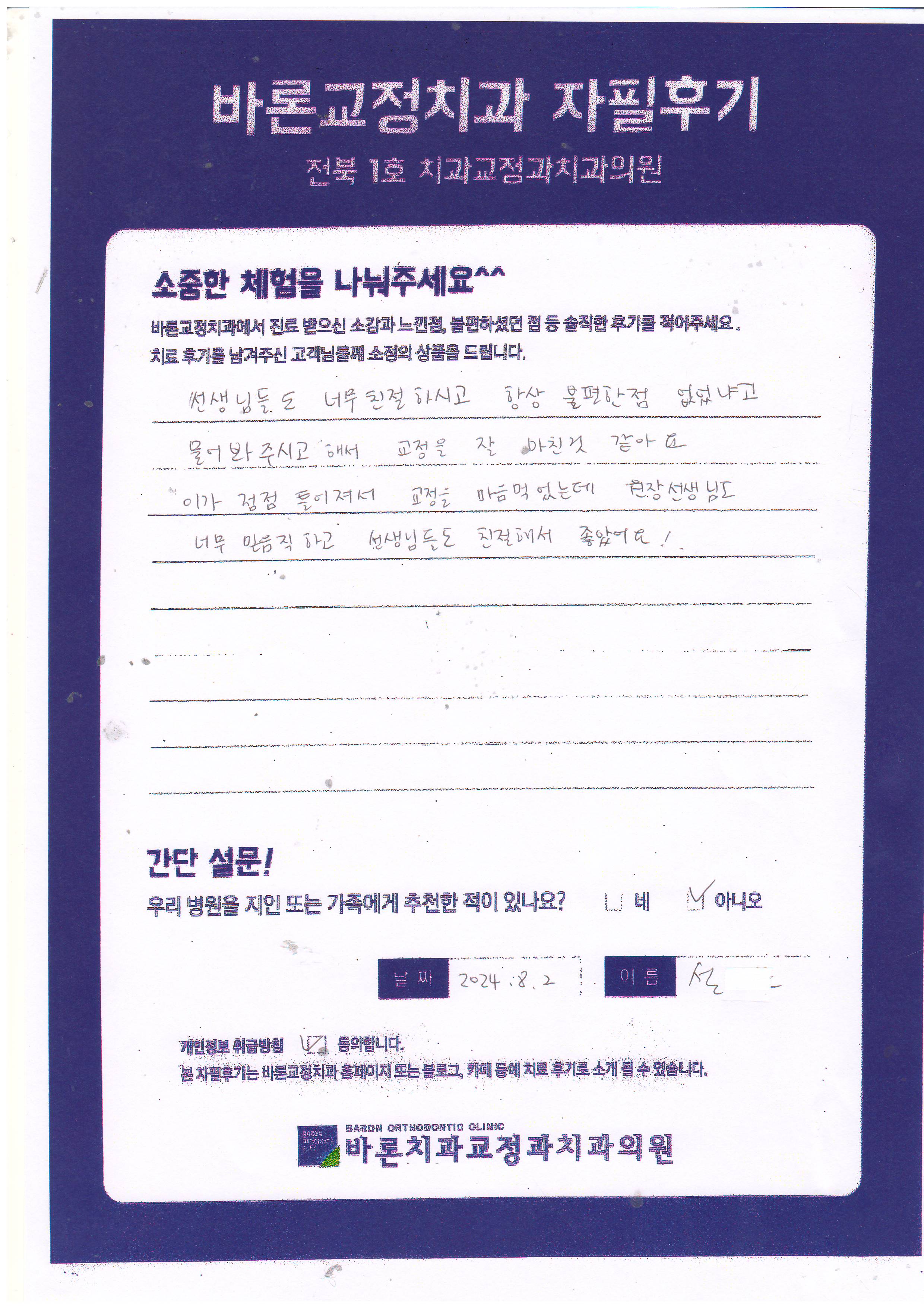 선생님들도 너무 친절하시고 항상 불편한점 없었냐고 물어봐주시고해서 교정을 잘 마친 거 같아요. 이가 점점 틀어져서 교정을 마음 먹었는데 원장 선생님도 너무 믿음직하고 선생님들도 친절해서 좋았어요! 설** 고객님 후기 감사드립니다.^^