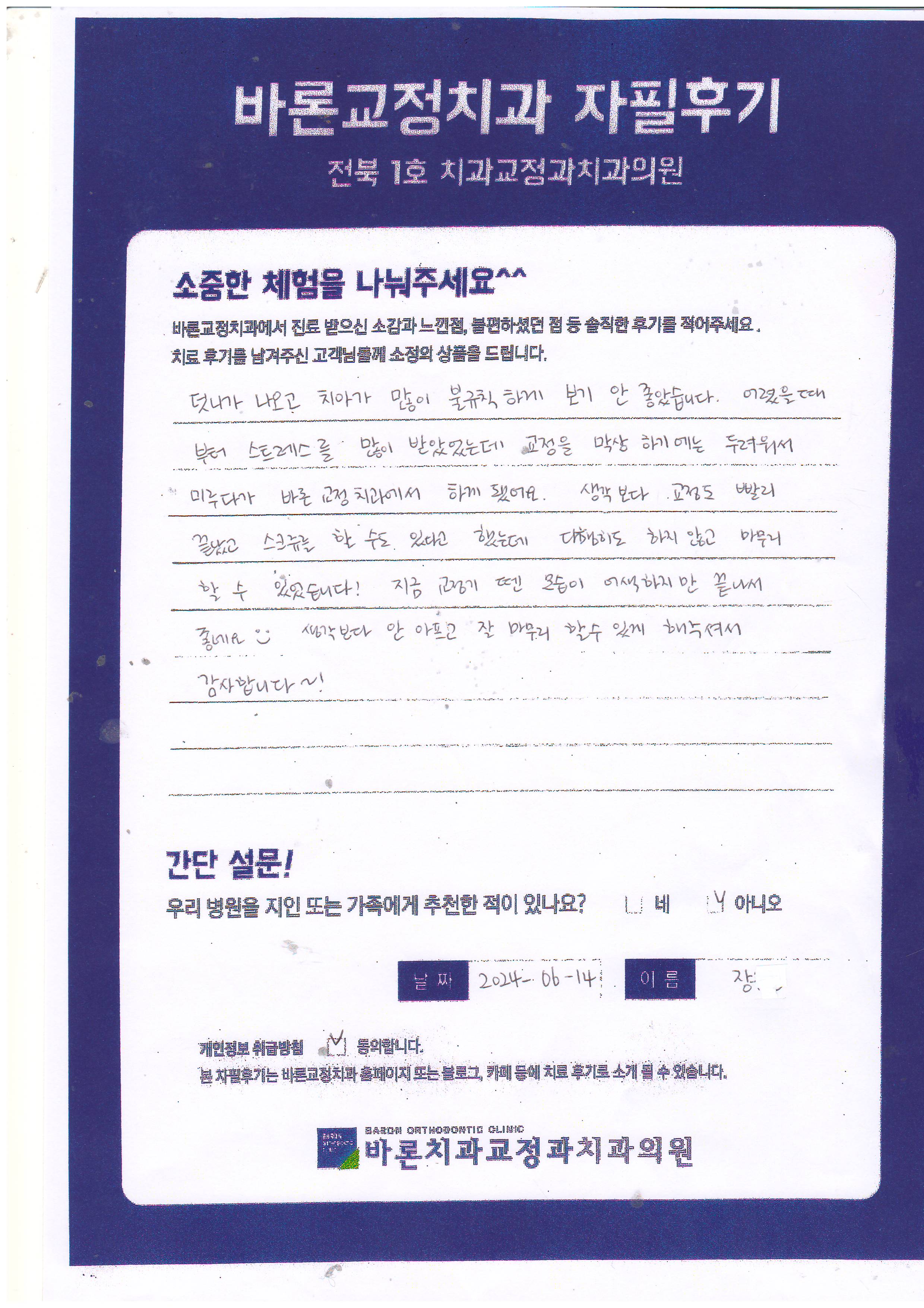 덧니가 나오고 치아가 많이 불규칙하게 보기 안 좋았습니다. 어렸을 때부터 스트레스를 많이 받았었는데 교정을 막상 하기에는 두려워서 미루다가 바론교정치과에서 하게 됐어요. 생각보다 교정도 빨리 끝났고 스크류를 할 수도 있다고 했는데 다행히도 하지 않고 마무리 할 수 있었습니다.! 지금 교정기 뗀 모습이 어색하지만 끝나서 좋네요.^^ 생각보다 안 아프고 잘 마무리 할 수 있게 해주셔서 감사합니다~! 장** 고객님 후기 감사드립니다.~!!^^