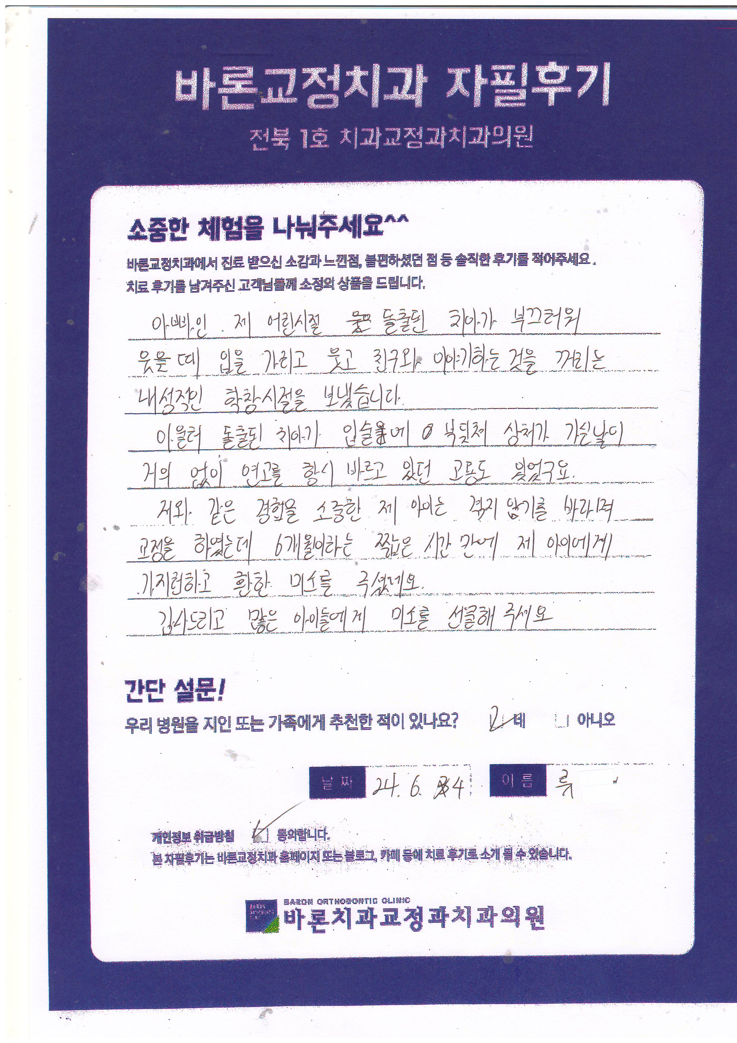 아빠인 제 어린시절 돌출된 치아가 부끄러워 웃을 때 입을 가리고 웃고 친구와 이야기 하는 것을 꺼리는 내성적인 학창시절을 보냈습니다. 아울러 돌출된 치아가 입술에 부딪쳐 상처가 가실 날이 거의 없어 연고를 항시 바르고 있던 고통도 있었구요. 저와 같은 경험을 소중한 제 아이는 겪지 않기를 바라며 교정을 하였는데 6개월이라는 짧은 시간 만에 제 아이에게 가지런하고 환한 미소를 주셨네요. 감사드리고 많은 아이들에게 미소를 선물해주세요 류** 고객님 후기 감사합니다.^^