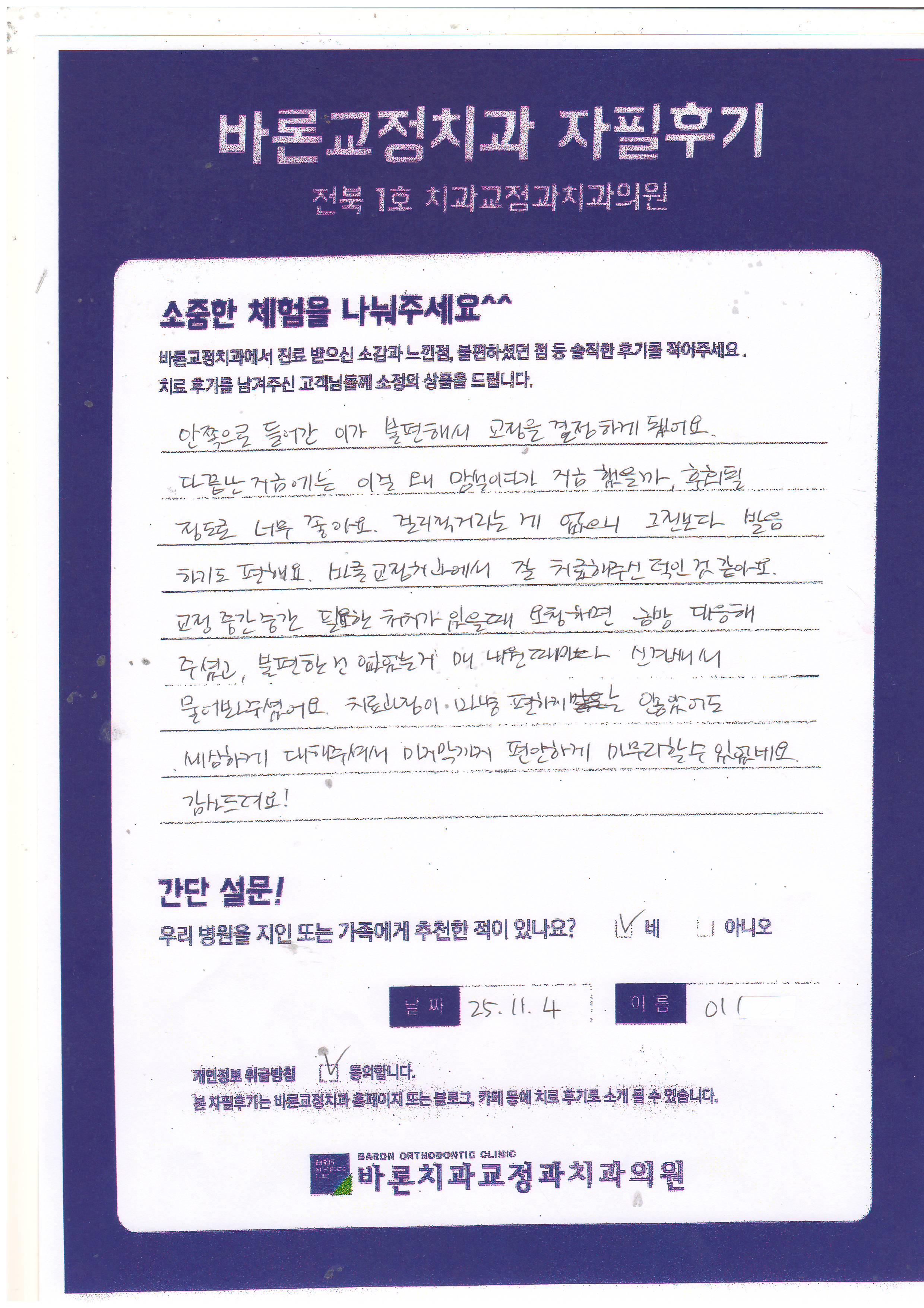 안쪽으로 들어간 이가 불편해서 교정을 결정하게 됐어요. 다 끝난 지금에는 이걸 왜 망설이다가 지금 했을까, 후회될 정도로 너무 좋아요. 걸리적 거리는게 없으니 그전보다 발음하기도 편해요. 바론교정치과에서 잘 치료해주신 덕인 거 같아요 교정 중간 중간 필요한 처치가 있을 때 요청하면 금방 대응해 주셨고, 불편한건 없었는데 매 내원 때마다 신경 써서 물어봐주셨어요. 치료과정이 마냥 편하지 않았어도 세심하게 대해주셔서 마지막까지 편안하게 마무리 할 수 있었네요. 감사드려요.! 이** 고객님 후기 감사드립니다.