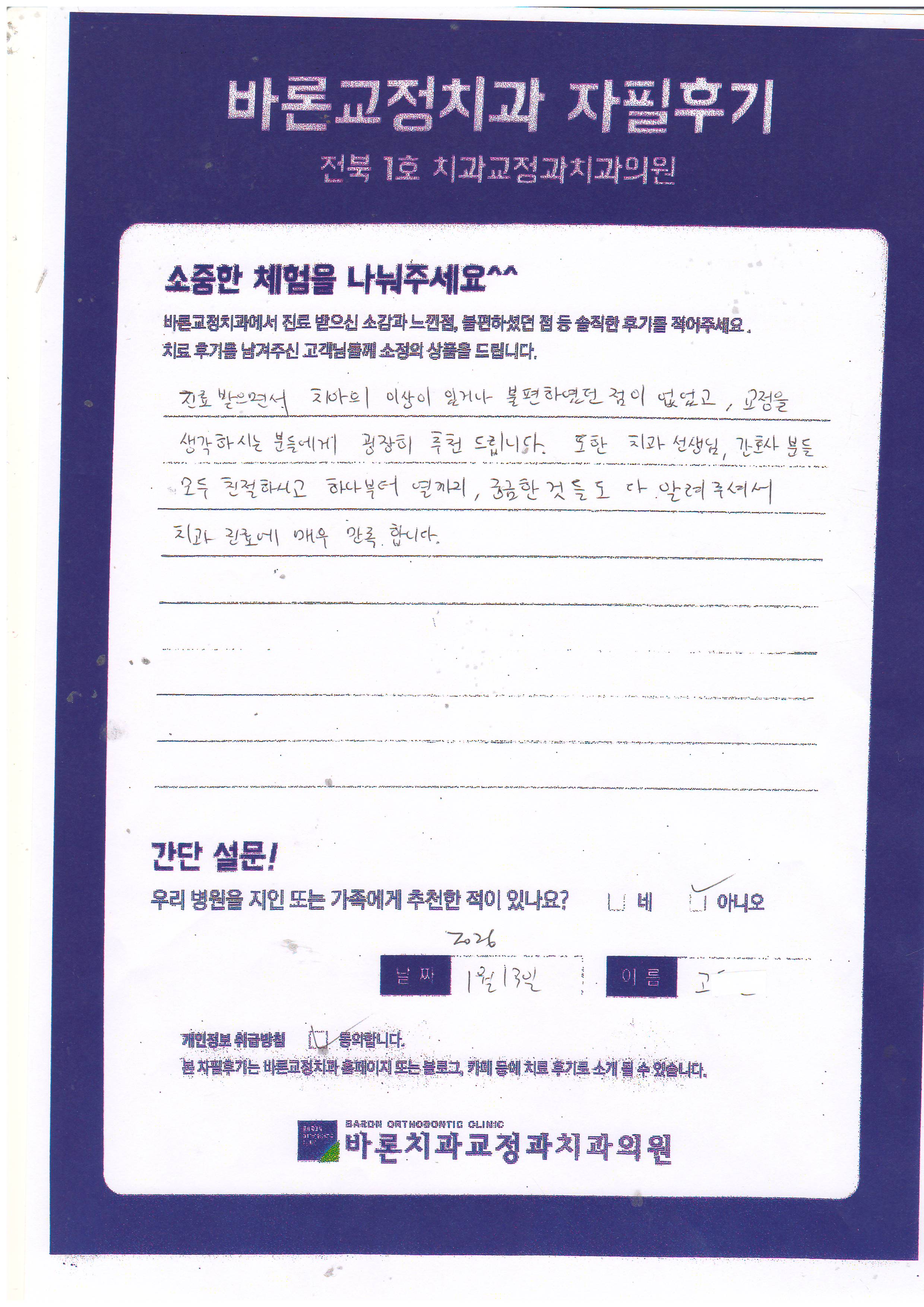 진료 받으면서 치아의 이상의 있거나 불편하였던 점이 없었고, 교정을 생각하시는 분들에게 굉장히 추천 드립니다. 또한 치과 선생님, 간호사 분들 모두 친절하시고 하나부터 열까지, 궁금한 것들도 다 알려주셔서 치과 진료에 매우 만족합니다. 고** 고객님 후기 감사드립니다.